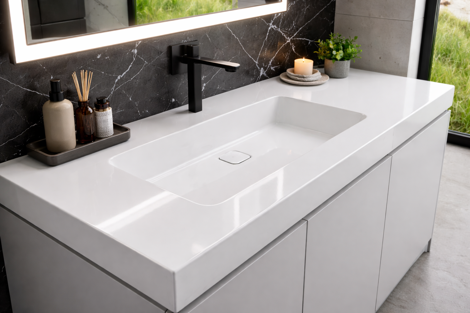 La vasque en résine est intégrée directement au plan de travail, formant un ensemble monobloc au design épuré. Disponible dans différents coloris et finitions, elle séduit par sa modernité et sa grande facilité d’entretien : un simple coup d’éponge suffit. Sans joint apparent, c’est la solution la plus partique au quotidien.