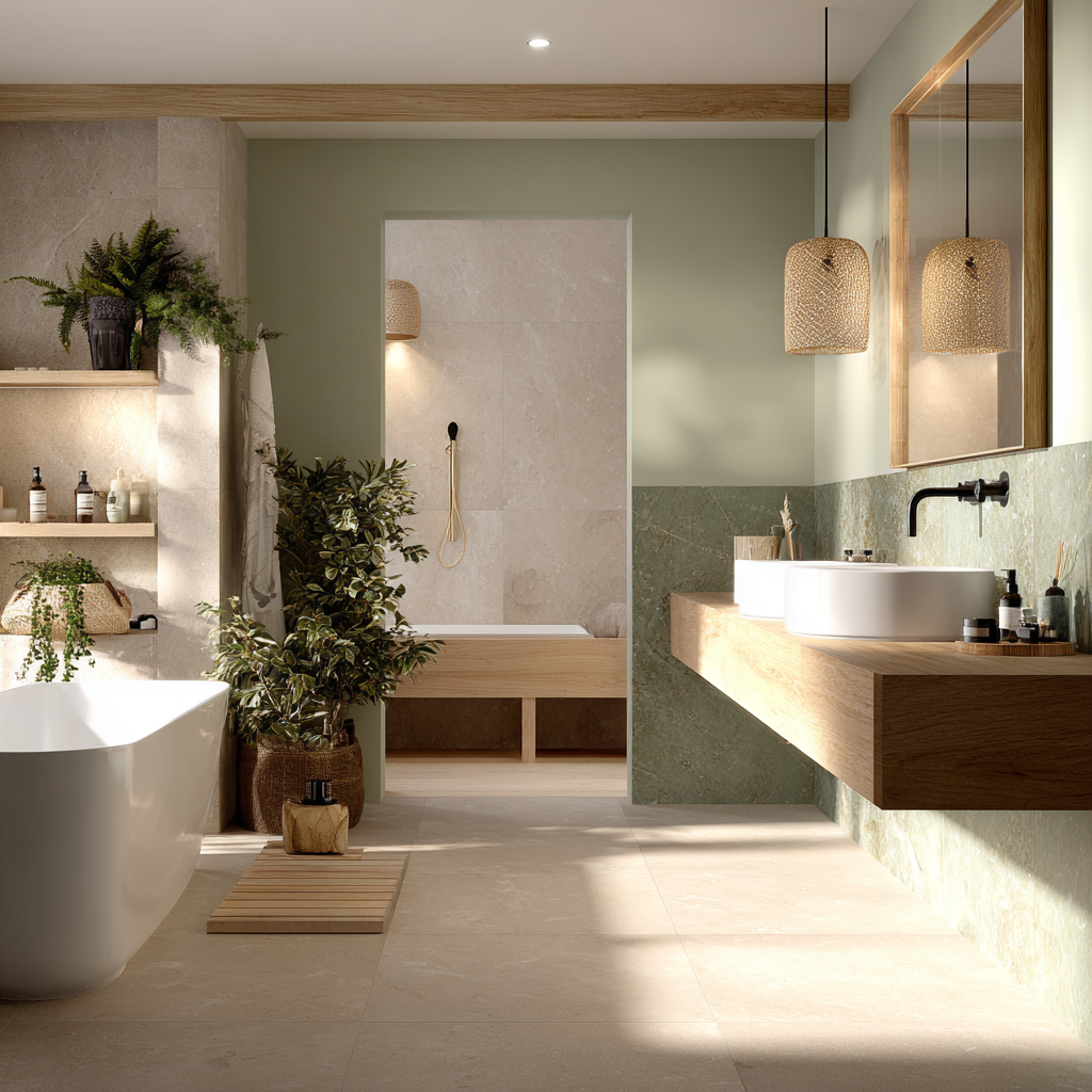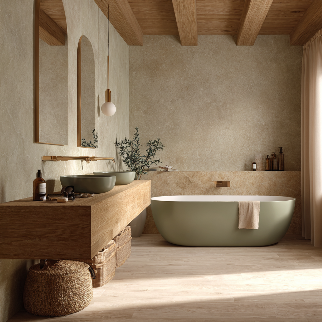 Inspirée par la nature, cette ambiance mise sur des matériaux bruts et des teintes douces comme le bois, la pierre ou les tons sable. L’ensemble crée une atmosphère apaisante et chaleureuse, propice à la détente, rappelant l’univers du spa et du bien-être à la maison.
