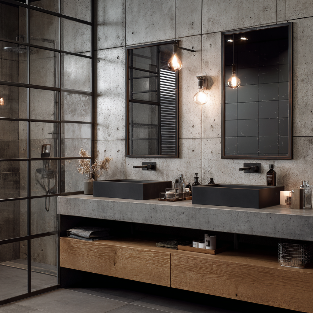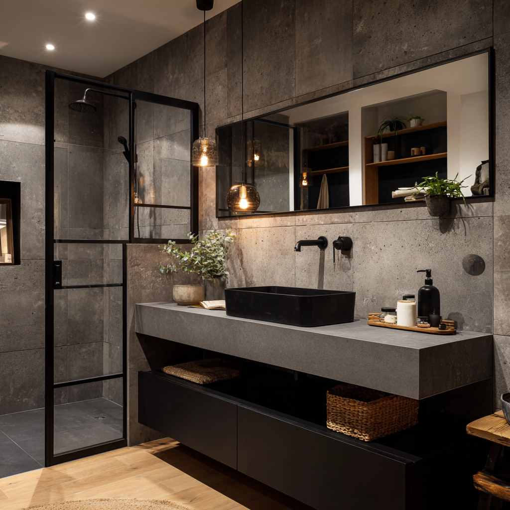 La salle de bain industrielle affirme un caractère fort à travers des matériaux bruts comme le béton, le métal ou le verre. Les lignes sont franches, les contrastes marqués, et les détails graphiques apportent une esthétique urbaine, moderne et structurée, sans renoncer au confort.