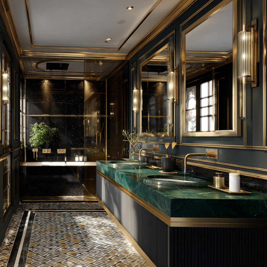 Graphique et sophistiquée, la salle de bain Art Déco joue avec les formes géométriques, les contrastes et les matières élégantes. Les touches de métal, les motifs raffinés et les couleurs profondes créent une ambiance chic et intemporelle, empreinte de caractère et de style.
