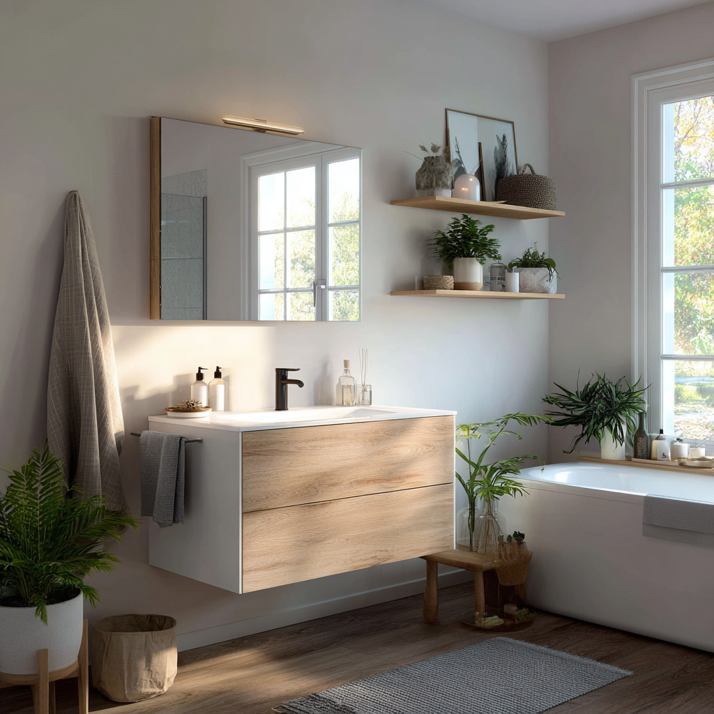 Épurée et lumineuse, la salle de bain scandinave privilégie la simplicité et la fonctionnalité. Les couleurs claires, le bois naturel et les lignes sobres créent un espace doux et harmonieux, facile à vivre, où chaque élément est pensé pour allier esthétique et bien-être.
